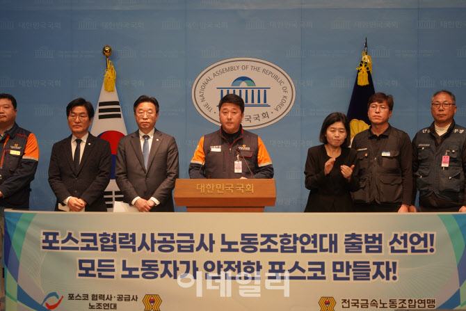 4일 ‘포스코 협력사·공급사 노동조합연대’가 서울 여의도 국회에서 출범을 알리고 원청 포스코의 성실한 대화 이행과 상생 협력을 촉구하는 기자회견을 열고 있다.(사진=한국노총 금속노련)
