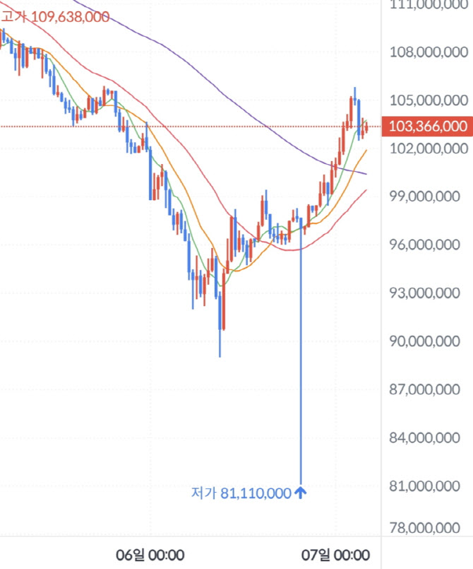 6일 오후 7시30분 이후 매도 물량이 나오면 빗썸 내 비트코인 시세는 다른 거래소 시세(9800만원대)보다 17%가량 낮은 8110만원까지 급락했다. (사진=빗썸)