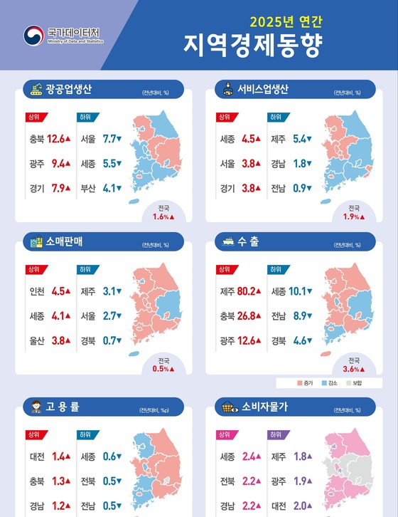연간 광공업 생산이 증가한 지역은 충북(12.6%), 광주(9.4%), 경기(7.9%) 등 5개 시도였다. 충북은 반도체·전자부품(35.8%), 전기장비(25.1%), 전기·가스업(51.1%)을 중심으로 생산이 늘었다. 광주는 전기장비(47.6%), 자동차·트레일러(10.9%) 등의 생산이 증가했다. 경기는 반도체·전자부품(12.5%), 의료·정밀(20.6%) 등이 늘었다.