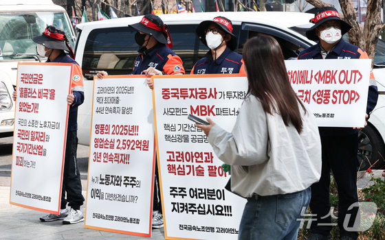 고려아연 정기 주주총회가 열린 24일 서울 중구 코리아나호텔 앞에서 고려아연 노조원들이 피켓 시위를 하고 있다. 2026.3.24 © 뉴스1 최지환 기자