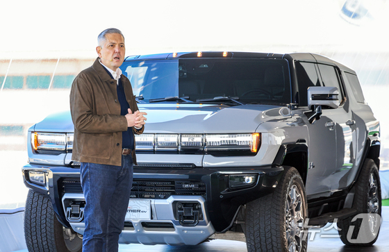 헥터 비자레알 한국GM 사장이 지난 1월 경기 김포 한국타임즈항공에서 열린 GMC 브랜드 데이에서 GMC 전기 SUV·픽업 '허머 EV'를 배경으로 발표하는 모습. 2026.1.27 © 뉴스1 이호윤 기자