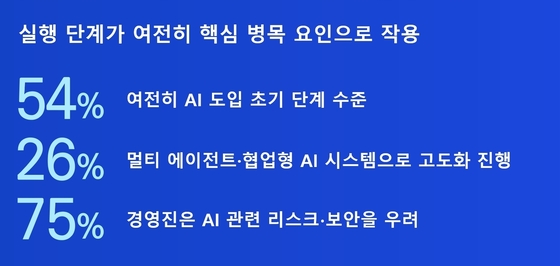 반면 전체의 11%에 해당하는 'AI 선도 기업'은 AI 에이전트를 전사적으로 확산하고 업무 프로세스 간 연계를 강화하며 경쟁우위를 확보한 것으로 분석됐다. 특히 AI 에이전트 도입은 빠르게 확산하는 추세로 32%는 이미 도입·확장 단계에 진입했고 27%는 복수의 AI 에이전트를 조직 전반에 걸쳐 연계·운영 중이다.