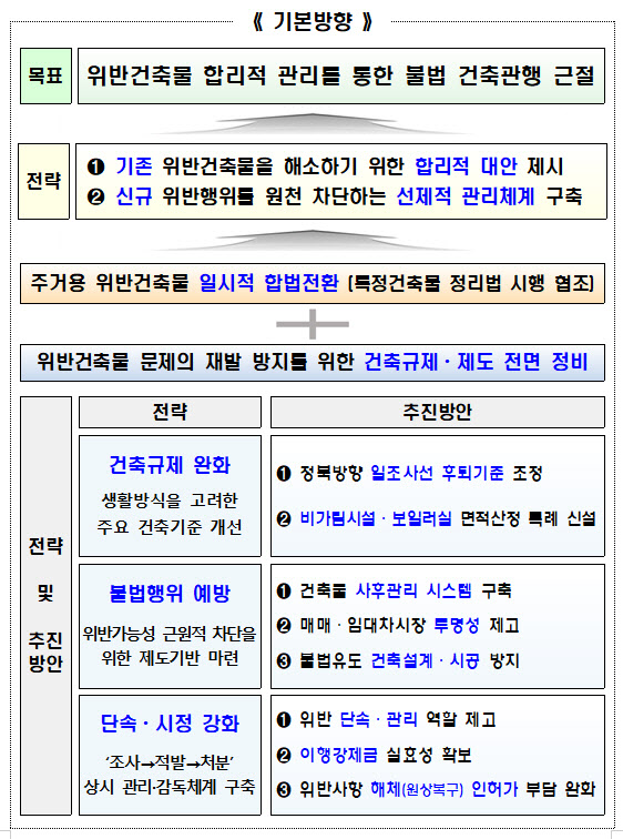 국토부는 국회에 계류 중인 ‘특정건축물 정리에 관한 특별조치법’과 연계해 이번 대책에 포함된 제도 강화 방안을 함께 심의할 수 있도록 신속히 발의할 방침이다. 법이 통과되면 국토부는 이번 대책에 포함된 제도 강화 방안을 국회에서 논의 중인 ‘특정건축물 정리에 관한 특별조치법’과 함께 심의될 수 있도록 신속히 발의한다는 방침이다. 법이 통과되면 즉시 하위법령과 지자체 업무 가이드라인을 마련해 시행하고 건축법 시행령 개정이나 행정적 개선과제도 지자체와 협의해 추진한다.