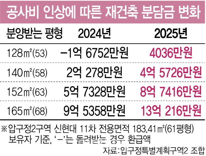 압구정2구역에서 가장 많은 가구 수를 보유한 신현대11차 61평형 전용 183.41㎡를 소유한 조합원이 재건축 이후 △전용 128㎡(53평형) 분양시 4036만원 △전용 140㎡(58평형) 분양시 4억 5726만원 △전용 152㎡(63평형) 분양시 8억 7416만원 △전용 165㎡(68평형) 분양시 13억 216만원 △전용 183㎡(76평형) 분양시 19억 6926만원 △전용 204㎡(84평형) 분양시엔 무려 26억 4306만원의 분담금을 추가로 내야한다.