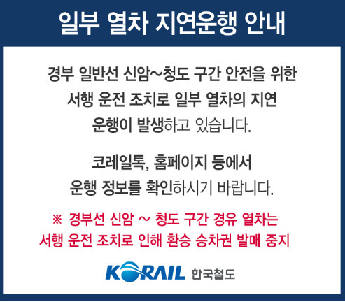지연이 잦아진 가장 큰 이유는 지난 8월 경북 청도에서 발생한 인명사고 이후 서행 조치가 내려졌기 때문이다. 당시 경부선 남성현역~청도역 구간에서 선로 점검 작업자가 무궁화호에 치여 2명이 숨지고 5명이 다쳤다. 이후 코레일은 신암~청도 구간에서 시속 100㎞로 달리던 열차를 40~60㎞ 수준으로 줄여 운행하고 있다.
