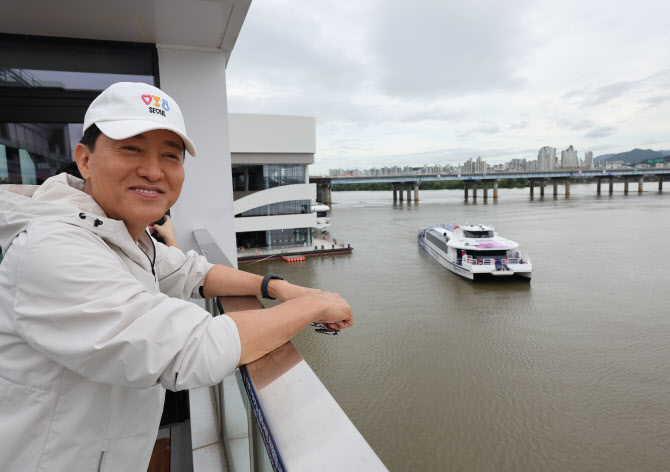지난 18일 오전 한강 여의도 선착장에서 오세훈 서울시장이 한강버스를 기다리고 있다. (사진=연합뉴스)