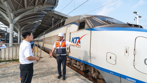정정래(오른쪽) 코레일 사장직무대행이 추석 특별 수송을 대비해 지난 1일 오송역에서 비상대기 중인 KTX를 점검하고 있다.(사진=코레일)