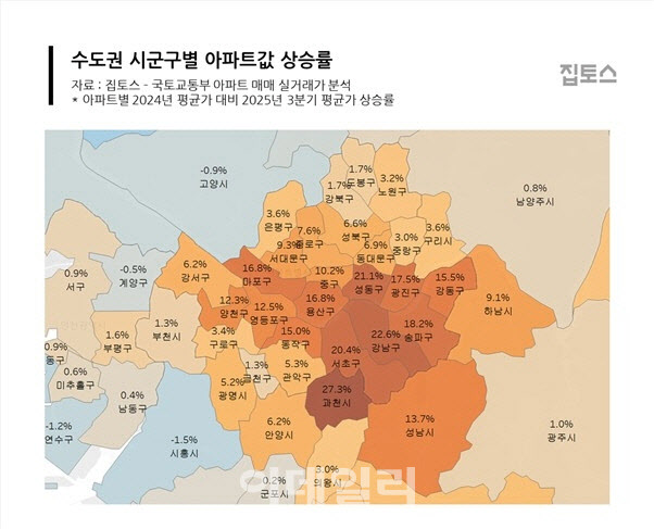 부동산 중개업체 집토스는 지난해와 올 3분기 거래가 있었던 수도권 아파트의 가격 변동률을 분석한 결과 이런 양상을 발견했다고 13일 밝혔다.