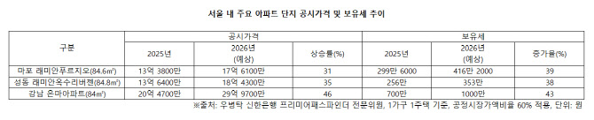 공시가격 현실화율(69%)과 공정시장가액비율(종부세 60%·재산세 45%)을 모두 동결하더라도 최근 시세 상승분만으로 세부담 상한(1.5배)에 도달하는 단지가 속출할 전망이다. 강북권 한강벨트 지역의 보유세 인상 폭이 특히 클 것으로 예상한다.