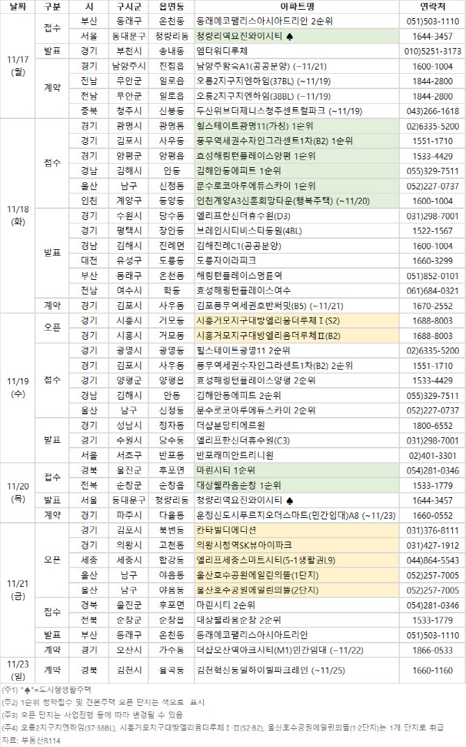 견본주택(모델하우스)은 경기 의왕시 고천동 ‘의왕시청역SK뷰아이파크’, 경기 시흥시 거모동 ‘시흥거모지구대방엘리움더루체Ⅰ·Ⅱ’, 세종 합강동 ‘엘리프세종스마트시티’ 등 5곳이 문을 연다.