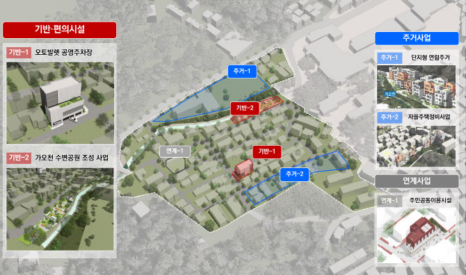 강북구 수유동 516-21번지 일대인 인수봉숲길마을에는 총 185억원이 투입돼 오토발렛 공영주차장 조성과 가오천 수변공원 조성 등이 추진된다.