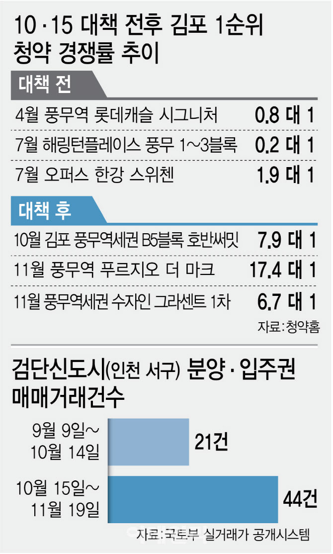 특히 10·15대책으로 서울 전역과 경기 12개 주요 지역이 규제 사정권에 들면서, 자금조달이 녹록지 않은 실수요자들의 이목이 김포 등 비규제 지역으로 확산했다는 평가다. 실제로 이번 단지에 앞서 10·15대책 이후 김포에서 청약을 진행한 2곳의 단지들도 견조한 경쟁률을 기록한 마당이다.