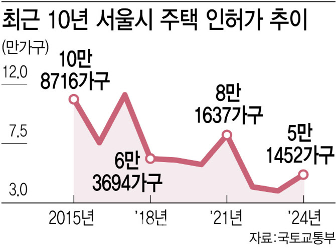 앞으로는 더 심각하다. 서울시의 지난해 주택 인허가 물량은 총 5만 1452가구로 부동산 호황기였던 2021년 8만 1637가구에 비해 약 37% 감소한 수준이다. 서울의 주택 인허가 물량은 부동산 불황기에 접어든 2022년 4만 2231가구로 전년 대비 반토막으로 줄어든 후 이듬해인 2023년에도 3만 9163가구로 감소했다. 지난해 공급 절벽 위기감에 그나마 인허가 물량을 늘렸지만 여전히 수요에는 못 미치는 수준이다.