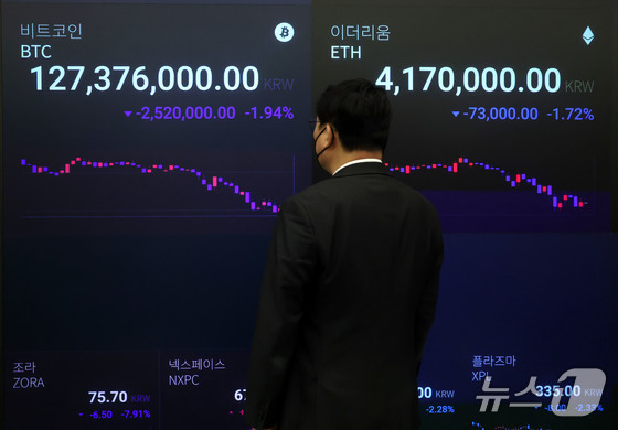 금리 인하 가능성이 급격하게 줄며 암호화폐(가상화폐)가 일제히 급락하고 있는 21일 서울 강남구 업비트 고객센터 전광판에 비트코인과 이더리움 거래 가격이 표시되고 있다. 2025.11.21/뉴스1 © News1 이광호 기자