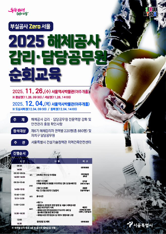 김승원 서울시 건설기술정책관은 “공사관계자의 안전관리 역량과 안전의식이 더욱 높아져야만 사고 발생을 최소화할 수 있다”며 “해체공사에서 감리자는 안전을 ㅤㅊㅚㅈ너방에서 지휘하는 책임자인 만큼 이번 순회 교육을 통해 안전사고 예방 역량을 강화해 해체공사 사고 요인을 선제적으로 차단하고 ‘부실공사 제로 서울’ 실현 기반을 마련하겠다”고 강조했다.