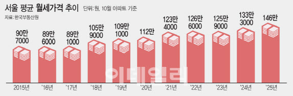 23일 한국부동산원 ‘10월 주택가격동향 조사’에 따르면 서울 아파트 평균 월세가격은 146만원으로 지난 2015년 7월 통계 작성 이래 최고치를 기록했다. 10년 전인 2015년 10월만 해도 90만 7000원 수준이던 데서 61%가량 뛴 것이다.