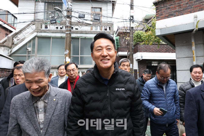 오세훈 서울시장이 25일 서울 중랑구 중화동 모아타운 현장을 찾아 사업 추진 현황을 점검하고 있다. (사진=이영훈 기자)