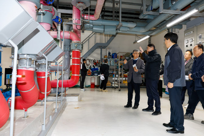황상하 서울주택도시개발공사(SH) 사장 등 현장 점검단이 임대주택 기계실에서 난방·전력 공급 설비를 확인하고 있다. (사진=SH 제공)