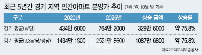 경기도 아파트 분양가는 5년 만에 평당 약 75.8% 급등했다. 지난 2020년 10월 말 평당 약 1434만 1800원이던 것이 약 1087만 6800원 오른 셈이다. 특히 최근 1년 간의 상승세가 두드러진다. 지난 9월 말 기준 평당 분양가격이 약 2252만 2500원인 점을 고려하면 불과 한 달 만에 269만 6100원(11.9%) 오른 셈이다.