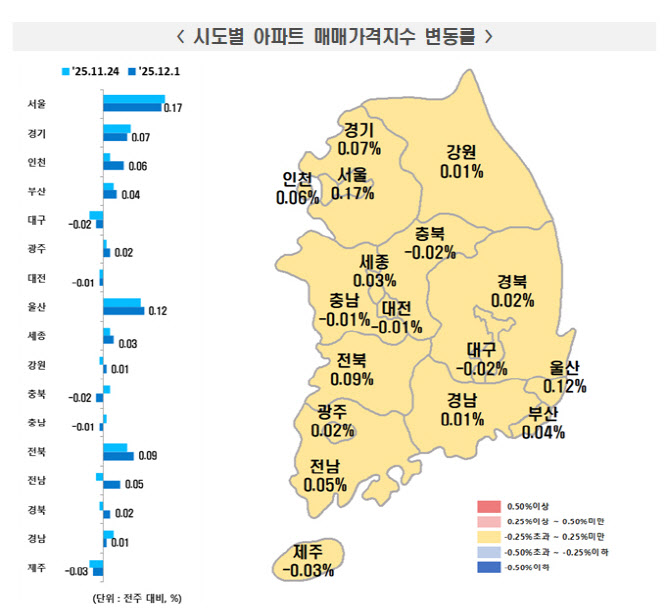 12월 첫째 주 시도별 아파트 매매가격지수 변동률. (사진=한국부동산원)