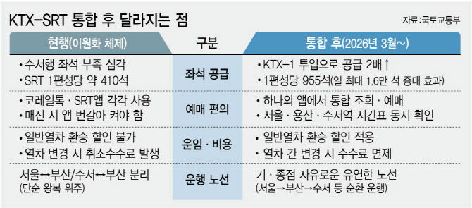다만 2026년 완전 통합까지 넘어야 할 산은 높다. 10년 만에 경쟁 체제가 막을 내리면서 ‘거대 독점 공기업’ 회귀에 따른 비효율과 파업 시 교통 대란 우려가 제기된다. 내년 초 교차 운행 시 발생할 ‘서울역 역차별’ 논란도 잠재적 문제다. 수서로 KTX가 빠지고 좌석이 적은 SRT가 서울역에 투입되면 서울역 좌석난은 가중될 수 있어서다. 이종 차량 결합의 기술적 안전성 검증과 낯선 노선에 투입될 기관사들의 숙련도 확보도 과제다.