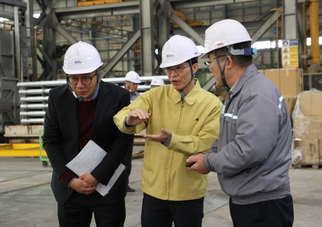 강성민 조달청 차장(가운데)이 10일 전북 군산시 소재 비축 알루미늄 이용업체인 하이호경금속(주)을 방문해 현장점검을 하고 있다. (사진=조달청 제공)