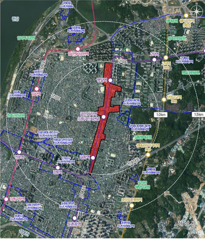 대상지역은 지하철 5호선 길동역·굽은다리역·명일역을 포함한 역세권 구간으로 강동구 남·북을 연결하는 양재대로 일대다. 양재대로변에는 상업·근린생활시설이 배치되고 이면부에는 저층 주거지가 분포돼 있다.