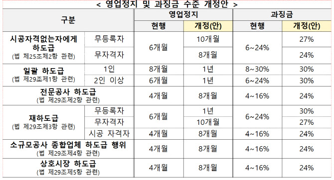 불법하도급 처분수준도 강화한다. 불법하도급을 한 자에 대한 영업정지는 현행 4~8개월에서 최소 8개월~최대 1년으로, 과징금은 현행 4~30%에서 전체 하도급대금의 24~30%로 상향한다. 이는 현행 ‘건설산업기본법’에서 정하고 있는 최고 수준(영업정지 최대 1년·과징금 최대 30%)이다.