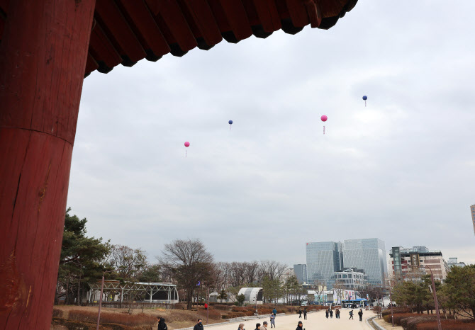 지난 9일 서울 종묘 입구에서 재개발로 지어질 세운4구역 내 고층 건물과 비슷한 높이의 서울시가 띄운 애드벌룬이 보인다. (사진=연합뉴스)