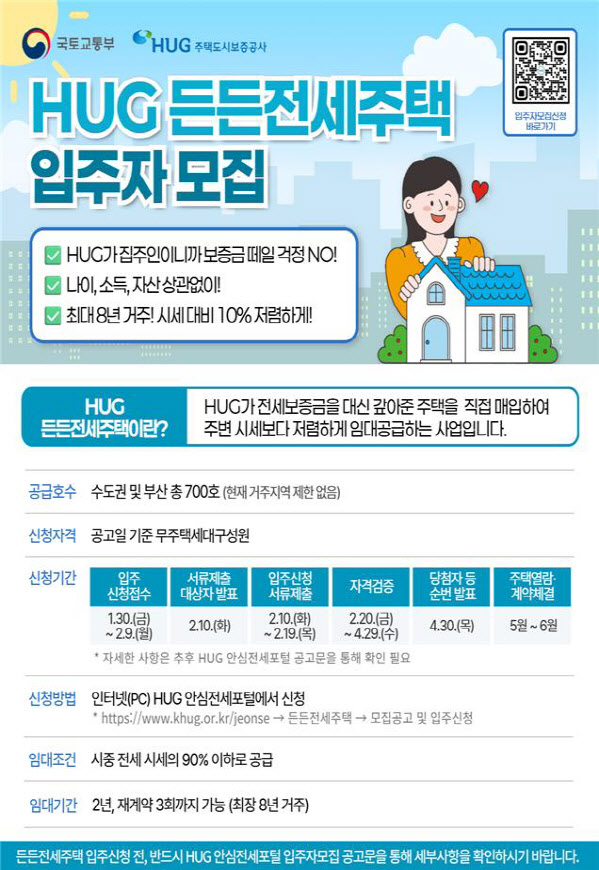 올해 허그는 지난해 공급 규모인 1800호보다 약 67% 증가한 총 3000호 이상의 든든전세주택을 공급할 계획이다. 입주 희망자들은 오는 30일부터 2월 9일까지 ‘허그 안심전세포털’을 통해 온라인으로 신청할 수 있다. 허그는 무주택 여부 등 자격 요건 검증을 거쳐 4월 30일 최종 당첨자를 발표할 예정이다.