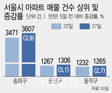 실제 송파·마포·동작구 등에서는 전고점 대비 가격을 낮춘 매물이 등장하고 있다. 마포구 ‘마포그랑자이’ 전용 84㎡는 전고점 대비 약 2억원 낮은 23억원대에 매물이 나왔고, 동작구 ‘신동아리버파크’도 호가가 14억원대 중반으로 전고점인 15억원대에서 하향 조정됐다. 지난해 상승 폭이 컸던 지역을 중심으로 매물 수도 소폭 증가했다. 부동산 빅데이터 플랫폼 아실에 따르면 이날 기준 송파구 아파트 매매 매물은 3607건으로, 5일 전보다 3.9% 늘었다. 용산구(3.1%), 동작구(2.7%), 서초구(2.3%), 강동구(1.6%) 등이다.