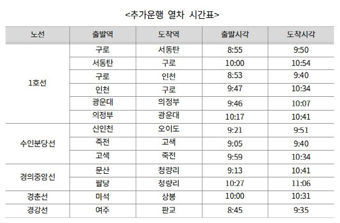 대상 노선은 1호선(경부·경인·경원선)과 수인분당선, 경의중앙선, 경춘선, 경강선 등 5개다. 코레일은 수도권 전역에 많은 눈이 예상되는 만큼 열차를 증편해 혼잡도를 완화하는 등 폭설에 따른 출근길 불편을 줄인다는 계획이다.