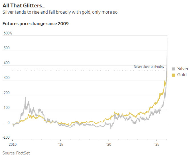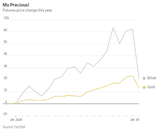 월스트리트저널(WSJ)은 1일(이하 현지시간) “귀금속 가격 급등을 설명하는 여러 가설이 있지만 어느 것도 실제 시장 데이터로 뒷받침되지 않는다”면서 “과도한 상승은 투기적 거품이며, 뒤늦게 뛰어든 투자자들은 큰 손실 위험에 직면할 수 있다”고 경고했다.