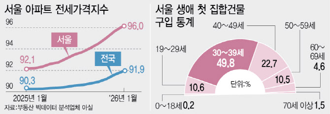 대법원 등기정보광장에 따르면 2025년 한 해 동안 서울에서 집합건물(아파트·연립·오피스텔 등)을 생애 최초로 구입해 소유권 이전 등기를 마친 건수(6만 1159건)는 직전 연도인 2024년보다 약 25% 증가했다. 주목할 점은 매수 행렬을 30대가 주도하고 있다는 점이다. 지난해 서울 지역 30대 생애 첫 매수 건수는 3만 481건으로, 전체 생애 첫 매수자의 절반에 육박하는 49.8%를 차지했다. 생애 첫 매수자 2명 중 1명은 30대인 셈이다. 30대 매수 비중은 2023년 42.9%, 2024년 46%에 이어 지난해 50% 선에 근접하며 가파른 상승세를 보이고 있다. 이는 소득 여력이 상대적으로 부족한 20대(10.6%)나 이미 주택을 보유했을 가능성이 큰 40대(22.7%) 이상 세대와 달리, 결혼과 출산 등 생애 주기에 진입한 30대가 전월세난의 직격탄을 맞고 매매로 선회했기 때문으로 풀이된다.