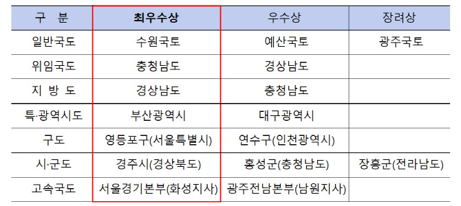 최우수 기관은 △충청남도(위임국도) △경상남도(지방도) △부산시(특·광역시도) △서울시 영등포구(구도) △경북 경주시(시·군도) △한국도로공사 서울경기본부 화성지사(고속국도) △국토부 수원국토관리사무소(일반국도) 등이다.
