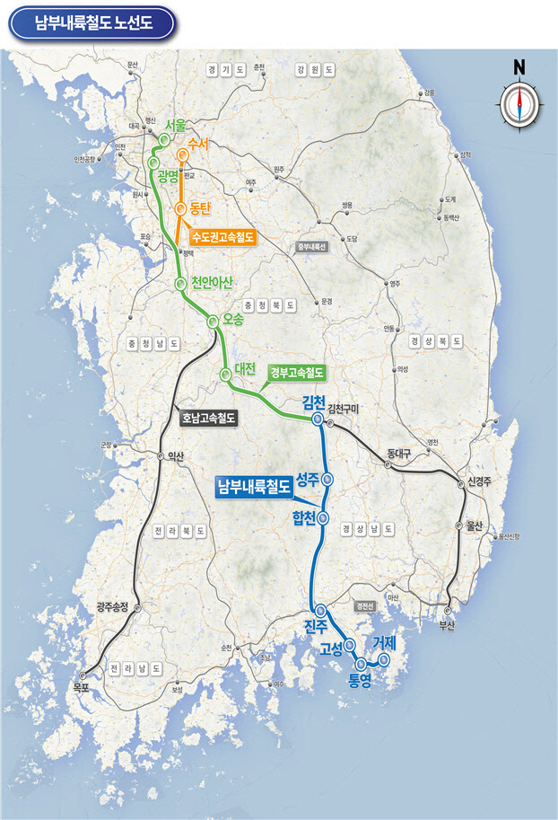 남부내륙철도가 개통되면 KTX-청룡이 하루 50회 운행(서울·수서~거제행 36회, 마산행 14회) 예정이다. 서울~거제간 이동 시간은 현재 4시간 30분~5시간대(버스·승용차 기준)에서 2시간 50분대로 크게 단축될 전망이다.