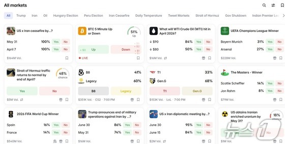현재 폴리마켓에는 정치·군사 이슈 외에도 △WTI 원유 가격 △서울 기온 △일론 머스크 테슬라 최고경영자(CEO)의 게시글 수 등 다양한 주제의 투표가 개설돼 있다.