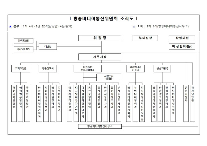 전체적인 조직도 확대됐다. 방미통위 사무처는 4국 3관 22과 4팀 1사무소, 총 316명 정원으로 꾸려졌다. 특히 과학기술정보통신부에서 인터넷·케이블TV 인허가, 뉴미디어·디지털 방송정책 관련 조직(1국 3과 33명)이 이관돼 ‘방송미디어진흥국’이 신설됐다. 이 과정에서 강도성 전 과기정통부 방송진흥정책관이 국장으로 자리를 옮겼으며, 이항재 방송진흥기획과장, 강동완 뉴미디어정책과장, 어정욱 디지털방송정책과장, 김새별 OTT활성화지원팀장 등 실무진도 함께 전입했다.