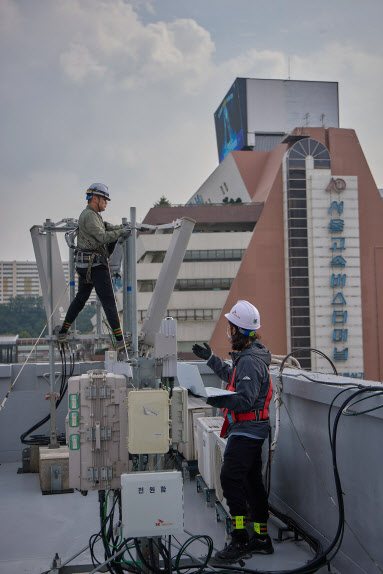SKT와 SK오앤에스 엔지니어가 고속터미널역 인근에서 통신장비를 점검하는 모습. (사진=SKT)