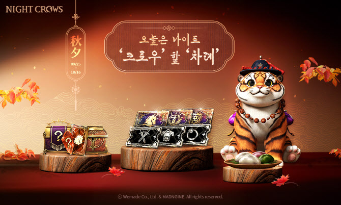 위메이드(112040)가 서비스하고 매드엔진이 개발한 MMORPG ‘나이트 크로우’가 추석 특별 이벤트 ‘오늘은 나이트 크로우 할 차례’를 10월 23일까지 진행한다. 이용자는 미션 달성 시 탈것·무기 외형·원소 재합성이 가능한 ‘클레멘스의 플래티넘 쿠폰’을 얻을 수 있고, 이벤트 던전 ‘만월의 연회’에서 수집한 교환 증표로 장비 복구 아이템, 영웅 장비 상자, 버프 아이템 ‘가막이의 송편’ 등을 교환할 수 있다.