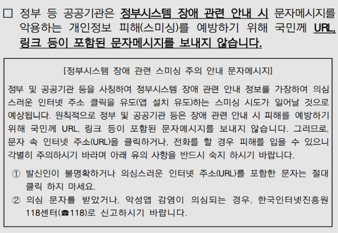 행정안전부와 과학기술정보통신부·한국인터넷진흥원(KISA)도 스미싱 피해를 예방하기 위해 정부 시스템 장애 관련 안내 알림에 URL 링크가 포함된 문자·SNS 안내 문자를 발송하지 않는다고 밝혔다.