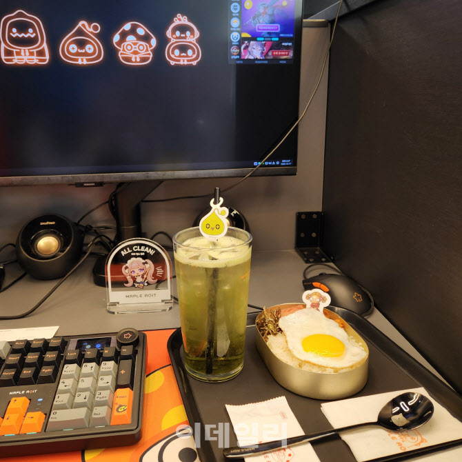 메이플 아지트 PC방에서 제공하는 슬라임 청포도 에이드와 네미의 도시락. (사진=안유리 기자)