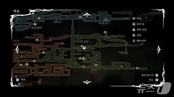 여러 이동 기술을 통해 밝혀진 맵들. 메트로바니아 장르 특유의 개미굴같은 모습을 볼 수 있다.(게임 스크린 갈무리)/뉴스1 © News1 윤주영 기자
