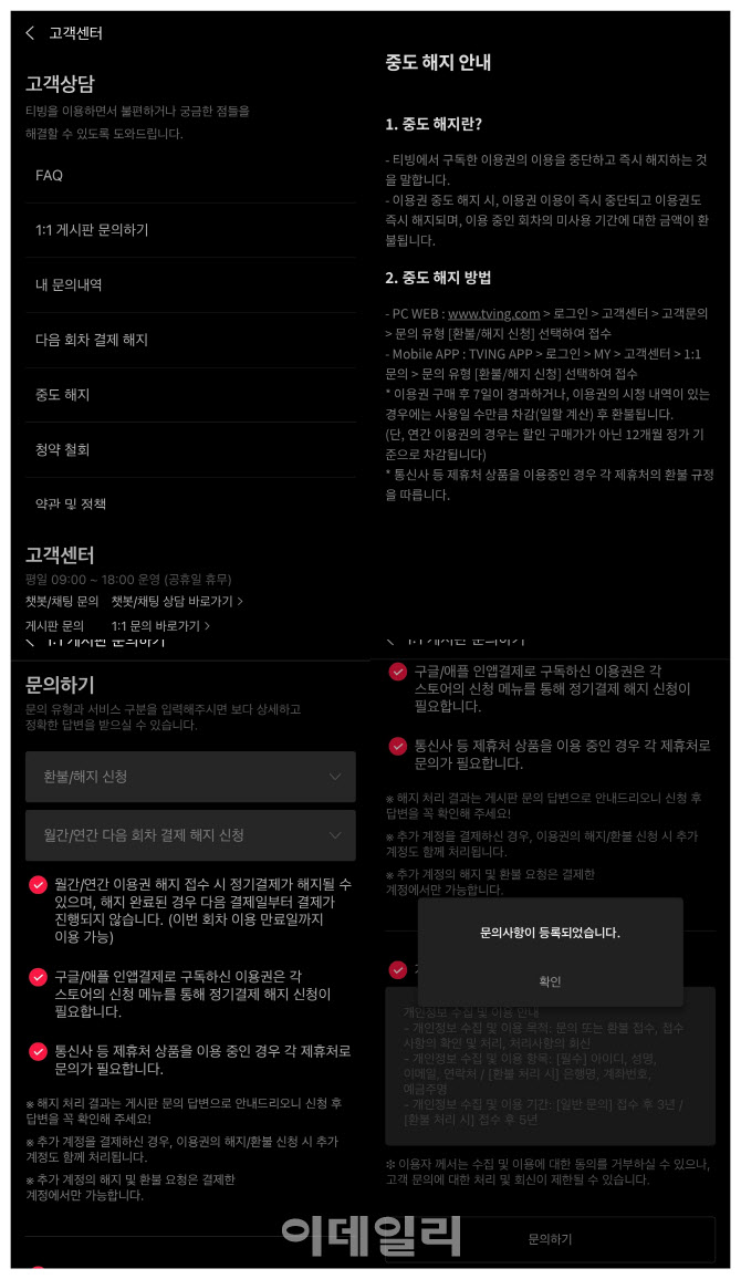 이번엔 반대로 해지를 시도해봤다. 구독 화면과 달리 ‘구독 해지’는 눈에 바로 띄지 않았다. 고객센터 화면으로 넘어가서야 비로소 △다음 회차 결제 해지 △중도 해지(즉시 해지) △청약 철회(사용내역이 없을 경우 결제 취소·환불) 선택지가 제시됐다. 중도 해지나 청약 철회를 하려면 고객센터에 1대1 문의를 해야 한다는 안내에 따라, 고객센터 게시판에 이메일·연락처를 기입하고 ‘환불/해지 신청’ 문의 글을 작성했다. 그러나 ‘문의사항이 등록되었습니다.’라는 문구를 끝으로, 언제 어떻게 환불 조치가 이뤄지는 건지 아무런 안내가 없었다.