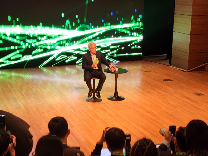 젠슨 황이 콜라를 마시면서 질의응답을 하고 있다.(사진=이데일리 강민구 기자)