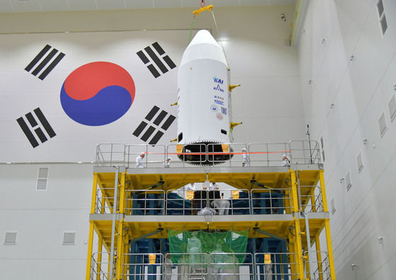 누리호 3단에 장착된 차세대중형위성 3호와 큐브위성 사출관 최종 점검 작업이 전남 고흥 한국항공우주연구원 나로우주센터에서 수행되고 있다.(한국항공우주연구원 제공)