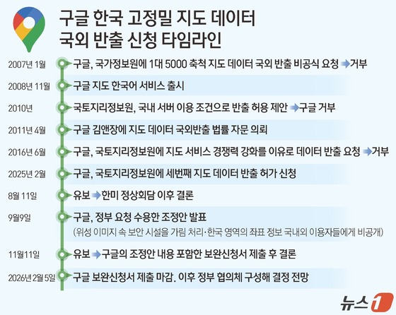 구글이 제출한 보완 신청서에 우리 정부 요구가 제대로 반영되지 못했다는 이유다.앞서 구글은 1대 5000 축척의 한반도 고정밀 지도를 제공할 것을 우리 정부에 요구했다. 정부는 민감 영상의 블러 등 보안 처리, 좌표 표시 제한 등을 조건으로 내걸었다.