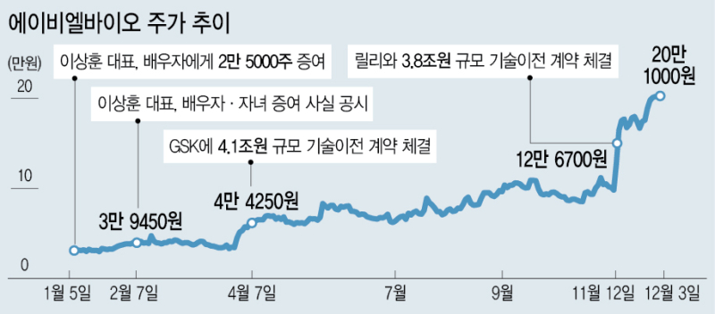 그뿐만 아니라 지난달 12일 릴리와 3조8000억원 규모 빅딜을 성사시키며 에이비엘바이오의 주가는 이틀 연속 상한가를 기록하며 16만3500원으로 뛰었다. 에이비엘바이오의 시총은 지난달 28일 10조원대를 돌파했으며, 주가는 4일 20만1000원에 장을 마치며 20만원대를 기록했다. 현 주가는 증여 당시 대비 409.5% 증가한 것이다.