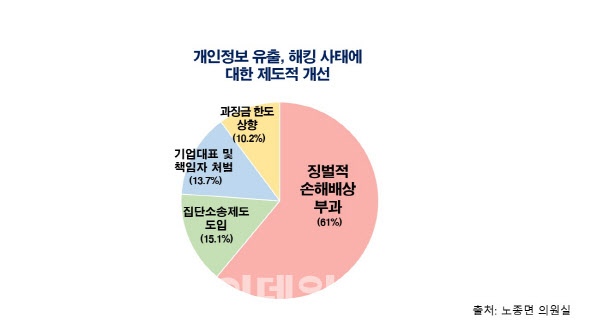마지막으로 개인정보 유출과 해킹 사태에 관련해 개선이 필요한 제도에 대해선 다수인 61%의 국민이 ‘징벌적 손해 배상 부과’를 꼽았다.