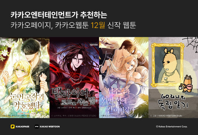 지난 1일 공개된 카카오페이지 웹툰 ‘눈먼 공작과 약혼했다’는 론칭과 동시에 12월 첫째 주 전 장르 웹툰 주간 랭킹 1위를 기록한 노블코믹스다. 로맨스판타지 장르에서 익숙한 ‘북부대공’ 설정을 새롭게 비튼 캐릭터와 전개로 주목받고 있다.